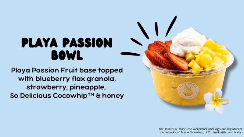Playa Passion Bowl 💛 The ultimate summer spoonful is topped off with blueberry flax granola, strawberry, pineapple, So Delicious Cocowhip™ & honey. Tangy, sweet, and bursting with tropical vibes.