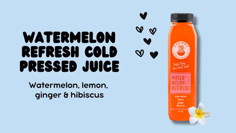 Watermelon Refresh Cold Pressed Juice 🍉 Hydration, but make it delicious. Fresh pressed watermelon with a splash of citrus keeps you cool and refreshed from sunrise to sunset, whether you're on or off the beach.